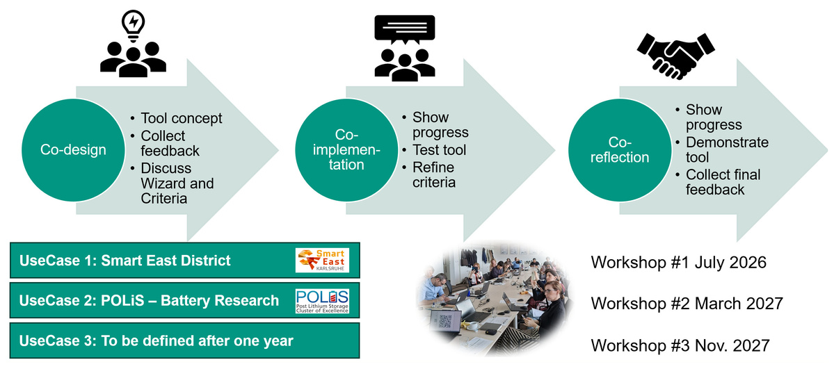 SustainFrame is developed building on exemplary use cases at KIT. These include POLiS, SmartEast, and a third use case yet to be defined. The use cases are integrated into the development of SustainFrame through interviews and three workshops (co-design, co-implementation, co-reflection).